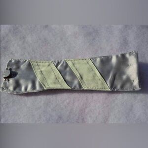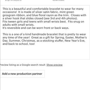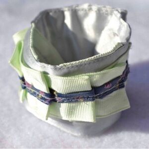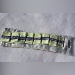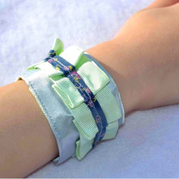 Pretty blue floral trim over pale green grosgrain ribbon pleated over silver satin fabric cuff bracelet. See last photo for more details on size, closure, etc! Nice for garden wedding, Spring and Summer outings, etc! Fits tween and teens. Also, it’s reversible, see photos.
