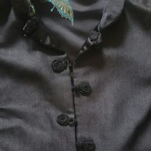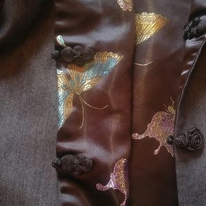 Reversible sz medium jacket with buttons. One side is black satin with multicolor butterfly print. Other side appears like a dark denim color. Worn once.