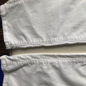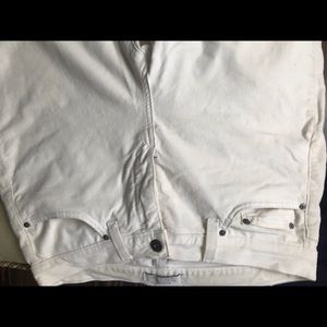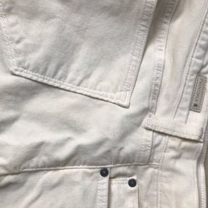 Ivory/cream colored velveteen pants, medium high waist, jeans style pockets, two tiny spots almost invisible on legs