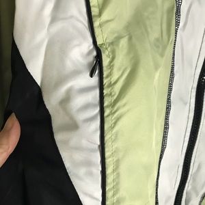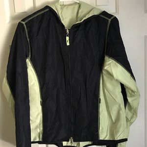 Two looks in one! Colors are navy, light green and white. This jacket is reversible with hidden pockets - no matter what side the jacket is flipped on! Also has a hood. Great condition.