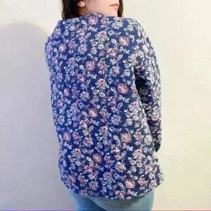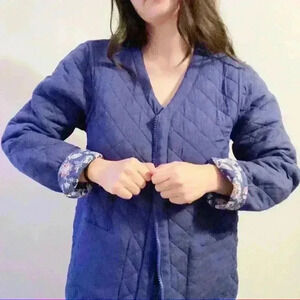 Reversible quilted jacket with floral print on one side and a solid navy blue on the other. Has small cute front pockets. Zips up the front. Brand is “Passage”. There is no material or size tag but I’m recommending for a size large. It’s modeled here on a size medium who is 5’1 and 130 lbs for reference. Approx measurements: