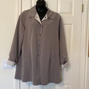 Beautiful reversible raincoat, green to stone. Size XL. Small pinhead size stain shown in last picture.