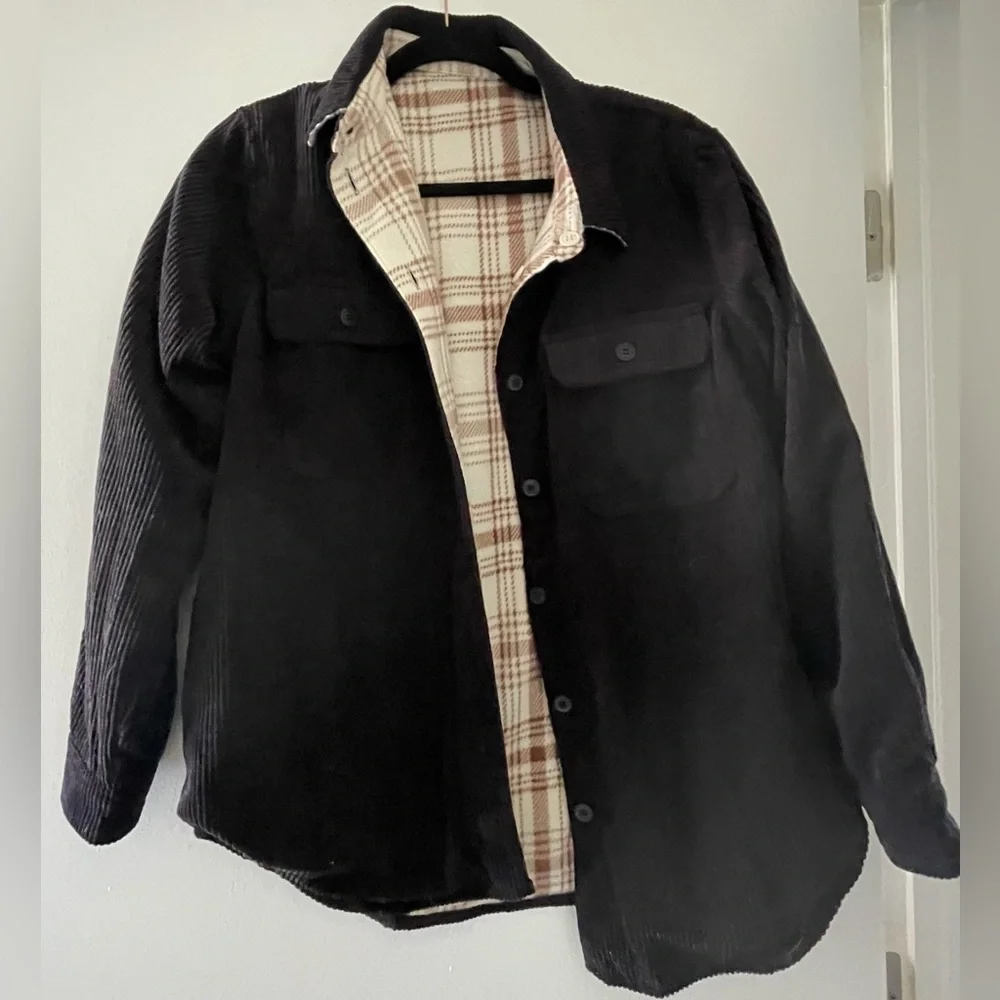 Reversible shacket. One side is black corduroy the other is a flannel.