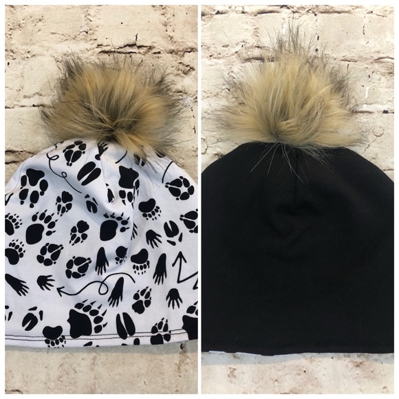 Reversible child’s beanie with removable faux fur pompom. Made to fit age 1-3, 19” head circumference.