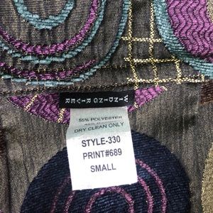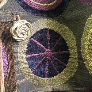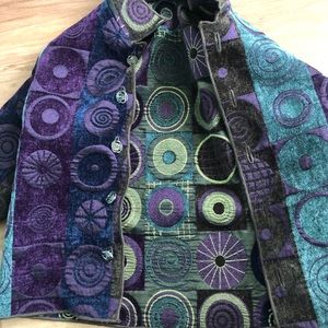 Reversible jacket with neat designs both ways. One side it velvet and the other is shiny!! Super cute buttons. In very good condition!! :)