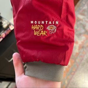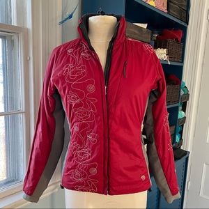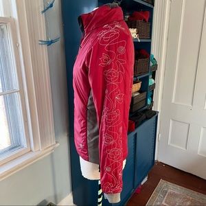 Black:red reversible jacket from REI by Mountain Hardwear. This jacket served me well for many years and has a lot more to give. Gorgeous floral embroidery on the red side and slimming color blocking either way you wear it. Great for both the days you want to blend in and the days you want to stand out. Warm but not bulky with also reversible pockets. 2 small imperfections shown in last 2 photos. Feel free to ask me questions or make me an offer!