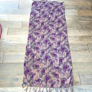 Scarf has two different prints on each side. No tags. Looks like handmade. Fabric feels like cotton. Has fringes on two sides. Approximate measurements 64”x25”