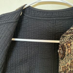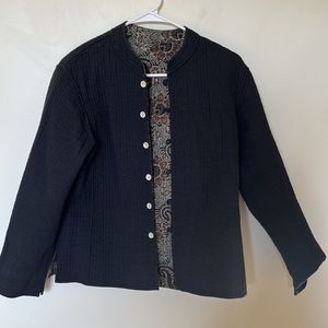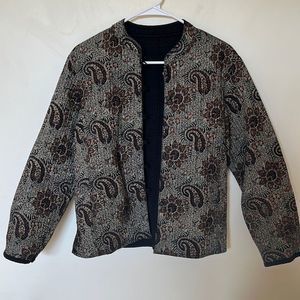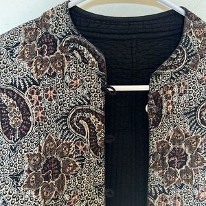 Beautiful vintage quilted reversible jacket. One side is black the other has flower shapes with brown and black accents.