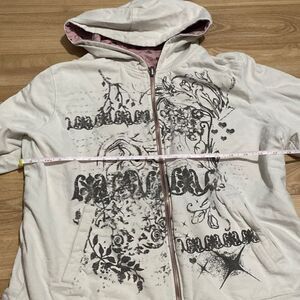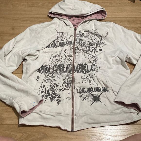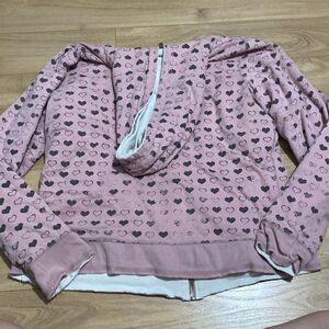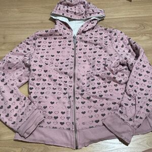 No brand tag but is super good quality. This is my all time favorite sweater because it’s 2 in 1. One side has an edgier style/pattern, the white side, and the other side is all pink with hearts all over. This is a super diverse piece but letting it go because I’m leaving college soon🥹