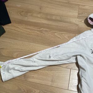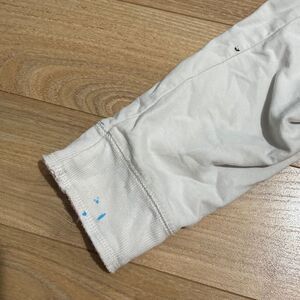 Has some flaws, paint splatters as pictured and has slight fraying on sleeves and bottom but I think its part of the design.