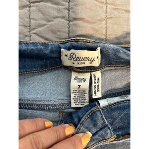 Revery Kids girls super soft and stretchy mid-rise ankle skinny jean. Medium wash and very lightly distressed in size 8. Great condition!
