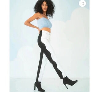 The On & Off Again is white in the front and black in the back. This two fabrics are joint together by a wavy side seem. This style has a fitted waist, a wedgie fit in the back, and a straight leg.