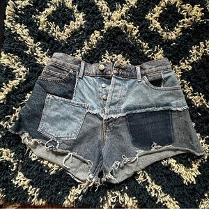 Tags; jorts, jeans, denim, booty shorts, western, patchwork, festival, summer, casual