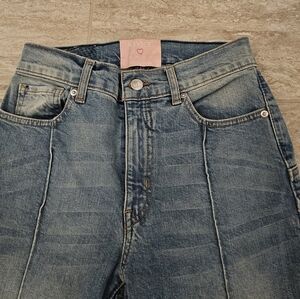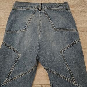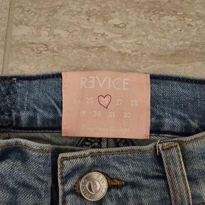 Cute Revice Women's Light Colored High Waist Skinny Blue Jeans with Front Seams. Backside has a Large Star Design.