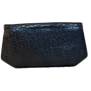 The sleek envelope silhouette includes a snap closure embellished with a gold-tone Revillon logo medallion. Inside is a black logo fabric-lined interior with a zippered side pocket.