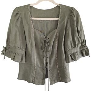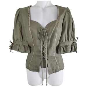Revintaria 100% Linen Frida Dusty Sage Green Fitted Corset Tie Peasant Blouse M