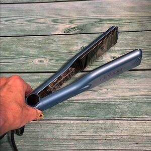 Sleek Revlon straightener in metallic blue. Ideal for smooth styling. EUC