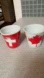 These fun red and white porcelain espresso cups look like small crumpled solo cups! One representing the Canadian Flag (Maple Leaf) and one Switzerland’s Flag. They stand approximately 2 1/2” high and are approximately 2 1/2” across.