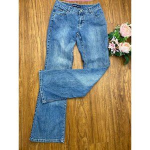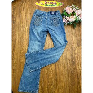 Revolt Juniors Denim Blue Jeans Size 7 Medium Wash Embroidered Pockets Has a Slight Flare. Retro Look, Condition is Excellent Pre Owned. Measurements are Flat and Approximate: waist:14" Rise: 8" Inseam: 31.5.