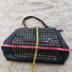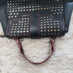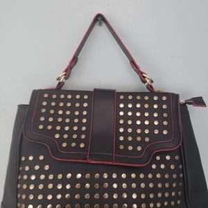 Stylish black bag with gold studs. Features a top handle and flap closure. Perfect for any occasion.