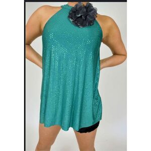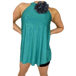 Revolution 2 piece set. Top is a green/teal sparkle tunic with shelf bra and clasp neck. Has a pinned rose that is removable (I took a pic without it as our dancers didn’t wear it. The model is wearing a different flower.)very fluid top.