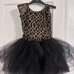 Step onto the stage in style with this bold, high-impact dancewear costume — perfect for solos, recitals, or themed performances. Black base accented with gold geometric shapes on the bodice for a modern, eye-catching effect. Short, fluffy layered black tutu skirt adds volume and movement.