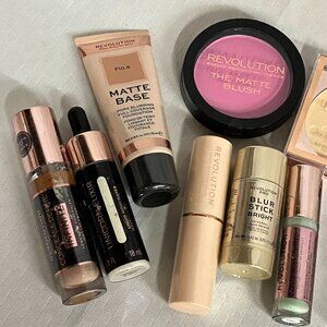 Revolution makeup lot, full face kit, drugstore beauty bundle, concealer, lipstick, lip kit, highlighter, powder, eyeshadow, foundation, primer, bronzer, resale cosmetics