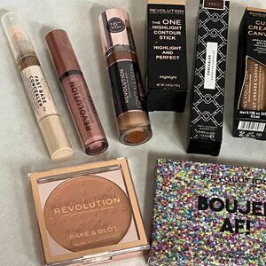 Revolution makeup lot, drugstore beauty bundle, full face kit, concealer, blush, lipstick, eyeshadow, foundation, powder, primer, brow block, highlighter, setting spray, resale cosmetics