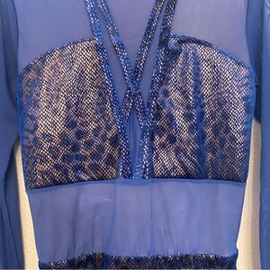 Front-lined stretch mesh unitard with built-in foil printed stretch velvet bodice and trunks features an elasticized waistband, back strap details, and collar with snap closure.