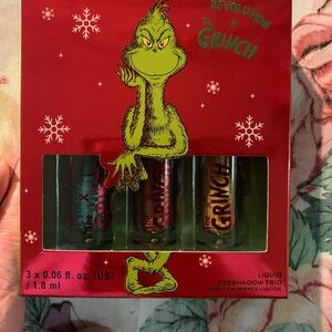 Revolution The Grinch liquid eyeshadow set. Includes three vibrant shades. Perfect for festive looks.