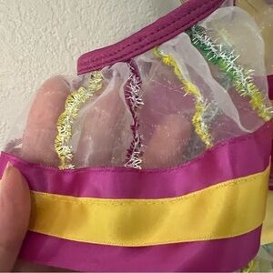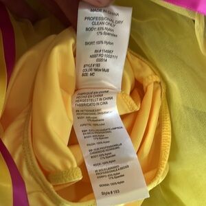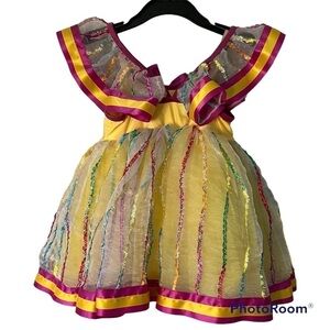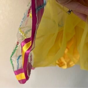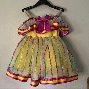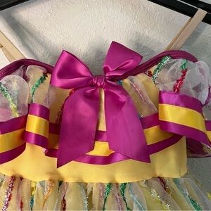 Revolution dance wear yellow & pink dance outfit costume, MC, comes with 2 hair bows, lace trim, can be worn on or off the shoulders, adjustable tan straps, pink bow on front, measurements shown, see online sizing chart, striped outer tulle, yellow tulle layers, yellow body suit, small mark on front bodice but is covered up with front layering.