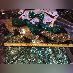 Revolution girls dance green & gold sequin costume size MC comes with bow for hair -Preowned - please look at all pictures - What you see is what you get :) .. please refer to all pictures all sales are final all proceeds go to my son’s medical bills please check my items out everyday I add new things . Give me your BEST OFFER. Combine and save on shipping I need everything sold. Comes from a smoke free home. #Revolution #dancecostume #costume