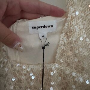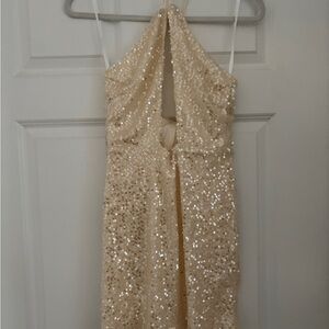 Dazzle in this chic white sequin dress. Backless design with halter neckline. Ideal for glamorous events.