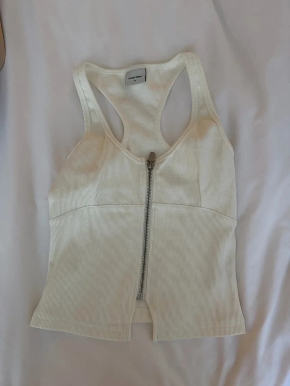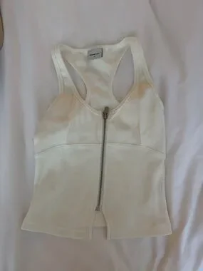 Ribbed zip-front tank with racerback silhouette. Front metal zipper closure. Soft cream knit fabric. Sleek fitted shape for layering or solo wear.