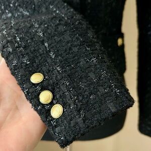 This black tweed cropped jacket from Asssignment for Revolve features gold buttons down the front and at the cuffs with A square neckline, structured shoulders, and a flattering fitted cropped silhouette.