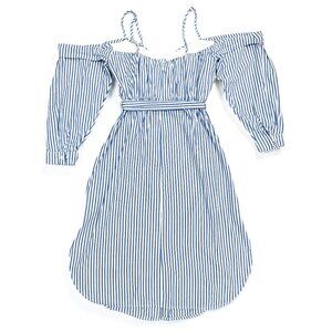 Stunning Bardot Paloma Pinstripe Shirtdress is both smart and romantic with the shoulder-barring design. Perfect for an elevated casual look, your next vacation, or night out! Good pre-loved condition.