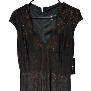Look glitzy and glamorous in the subtle design of the Betsy & Adam Long Cap Sleeve Glitter Ombre Gown featuring a fusion of vintage glitter with a modern geometric pattern. Floor-length dress. Sheath silhouette. Crafted from a glitter ombre adorned jersey. V-cut neckline with short cap sleeves. Concealed zippered back closure. Fully lined dress. 95% acetate, 5% spandex. Dry-clean.