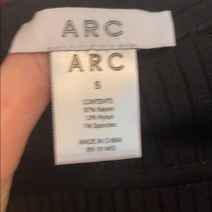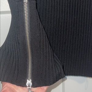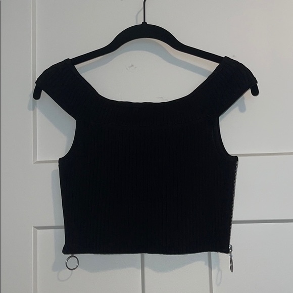 With a wide band off the shoulder neckline, and ring zippers on either side, this black ribbed knit crop top is universally flattering. The brand is ARC, purchased from Revolve - never worn!