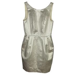Club Monaco Lana Dress in Silver. Sleeveless Jacquard Blouson Dress with Gathered Waist. Lightly Textured Lamé Constructs a Striking Fit and Flare Dress. Curved Seams Structure the Bodice, and Pleats Lend Soft Volume to The Skirt. On-Seam Hip Pockets Add a Casual Dress Touch to the Party-Ready Silhouette.