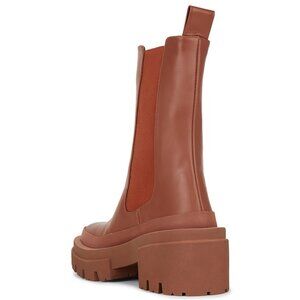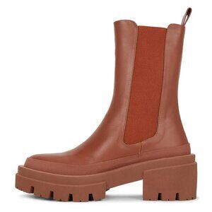 The perfect chunky fall brown boot, featuring a smooth leather upper with lug rubber sole. Made in Spain. Pull-on styling with heel tab. Approximately 50mm/2 inch heel and 13mm/0.75 inch platform. Sold out on Revolve.