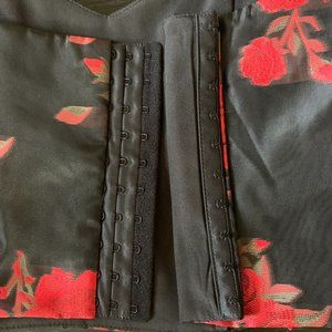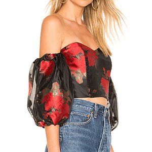 Lovers + Friends Gil Top has us dreaming of balmy nights strolling through the Spanish Riviera. Supported by light boning with a sweetheart neckline, the off the shoulder style is designed with romantic red roses that rest atop luxurious jacquard fabric.