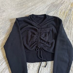 Revolve H: Ours cropped black sweatshirt ruched front ties at bottom can be cinched to make it shorter or longer crewneck