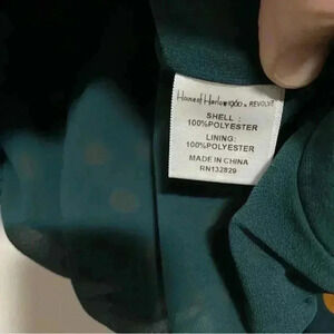 Details: ties at waist; ties at sleeve cuffs; polka dot; deep teal color; puff sleeves; cut out