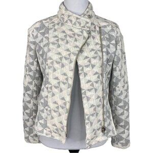 Revolve IRO women's size EU 36, it is the Otavia Multico Jacket, contemporary MOTO style sold at Revolve, geometric triangle pattern with light/dark grey, beige and light pink, asymmetrical full zip and snap closure, stand-up and fold over collar, two slash pockets, quilted raise stretchy fabric, white piping, zipper sleeves and raw hem bottom. Materials Shell 43% viscose, 33% cotton, 12% polyester, 11% acrylic, 1% elastane, Lining 65% polyester, 35% cotton. Care dry clean only. Condition is preloved very good, one small stain on inner lining as shown in pictures. Revolve Style No. IRO-WO103. Manufacturer Style No. 15SWP07OTAVIA. Please preview the measurements to ensure fit.