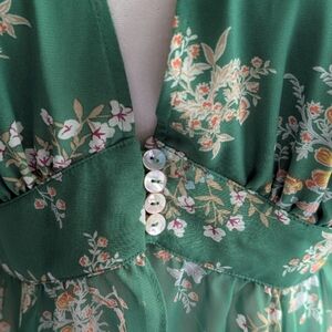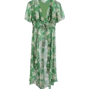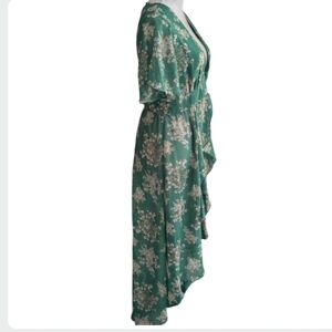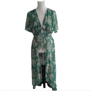 Stunning J.O.A. (Just One Answer) duster from Revolve in a dreamy sage green with delicate floral print. Features romantic flutter sleeves, deep V-neckline, and high-low hemline with gorgeous movement. Mother of pearl buttons at waist. Perfect as a swim coverup, festival piece, or styled with shorts/jeans. Lightweight, semi-sheer fabric.