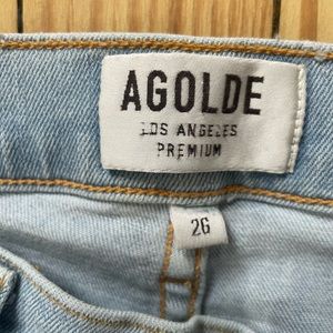 Lightly distressed light wash skinny jeans in size 26 by Agolde Los Angeles, carried by Revolve