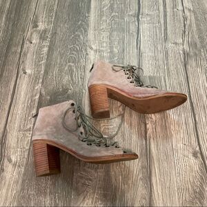 Jeffrey Campbell taupe suede lace up open toe sandal booties Lace-up closure and exposed back zip.