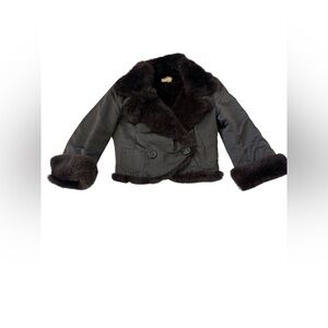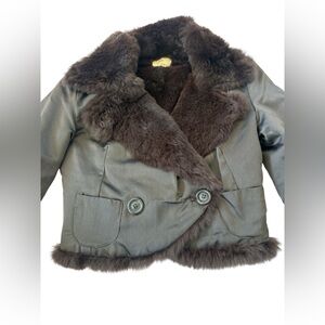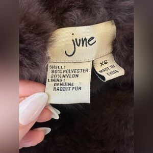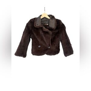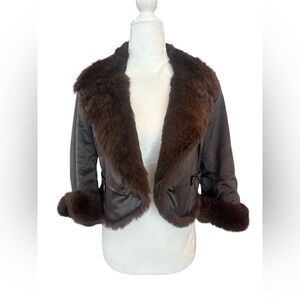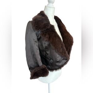 Revolve June Luxe vintage-inspired reversible cropped jacket with ultra-soft genuine rabbit fur and a satin body. The rich chocolate brown tone and plush collar give it a glamorous early-2000s look that pairs beautifully with dresses, denim, or eveningwear.