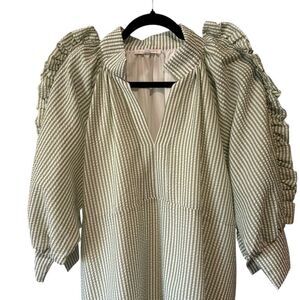 green and white striped seersucker fabric, a V-neckline, ruffled three-quarter length sleeves, and a ruffled hem.