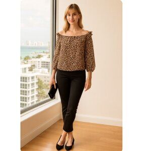 Revolve Krisa leopard print long sleeve blouse, short boxy fit, ruffles and elastic at the shoulder, off-shoulder style, sheer sleeves, body is lined. Light, flowy fabric. Cute, feminine, trendy animal print top.
